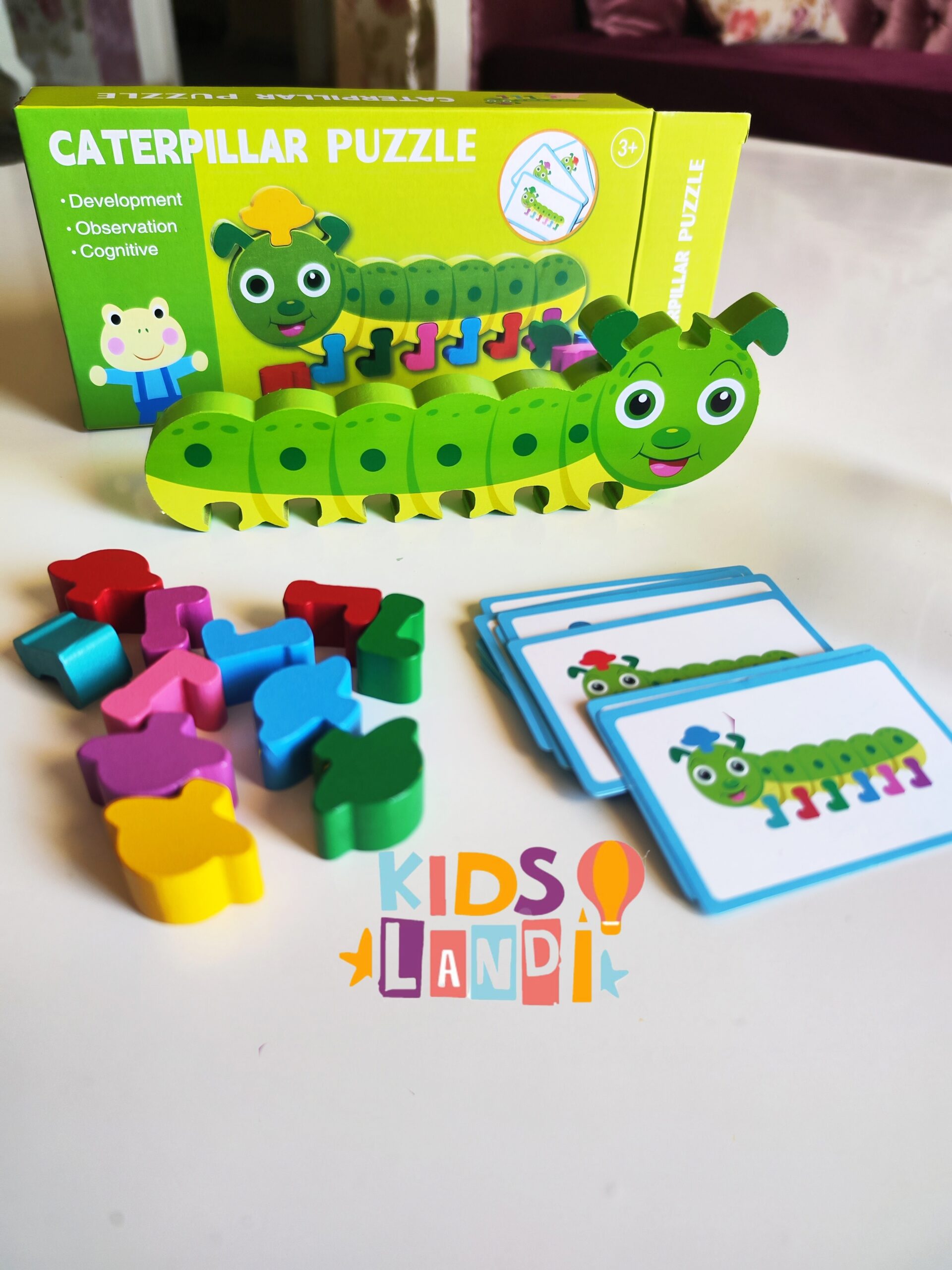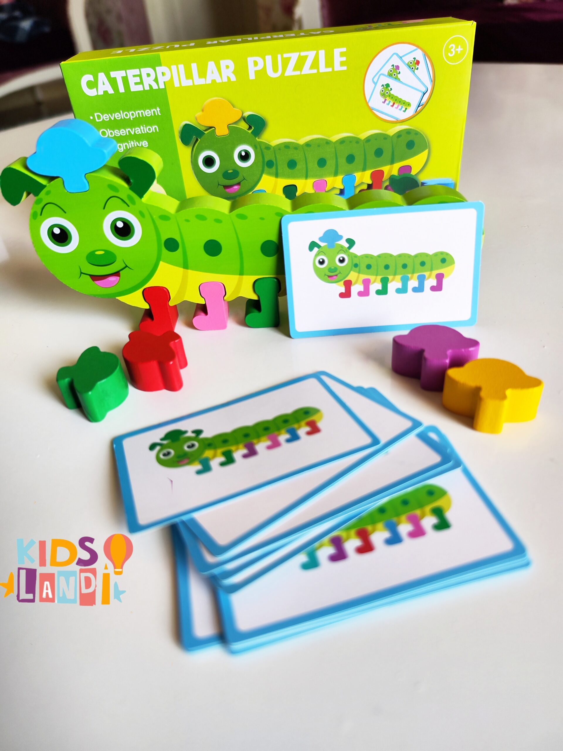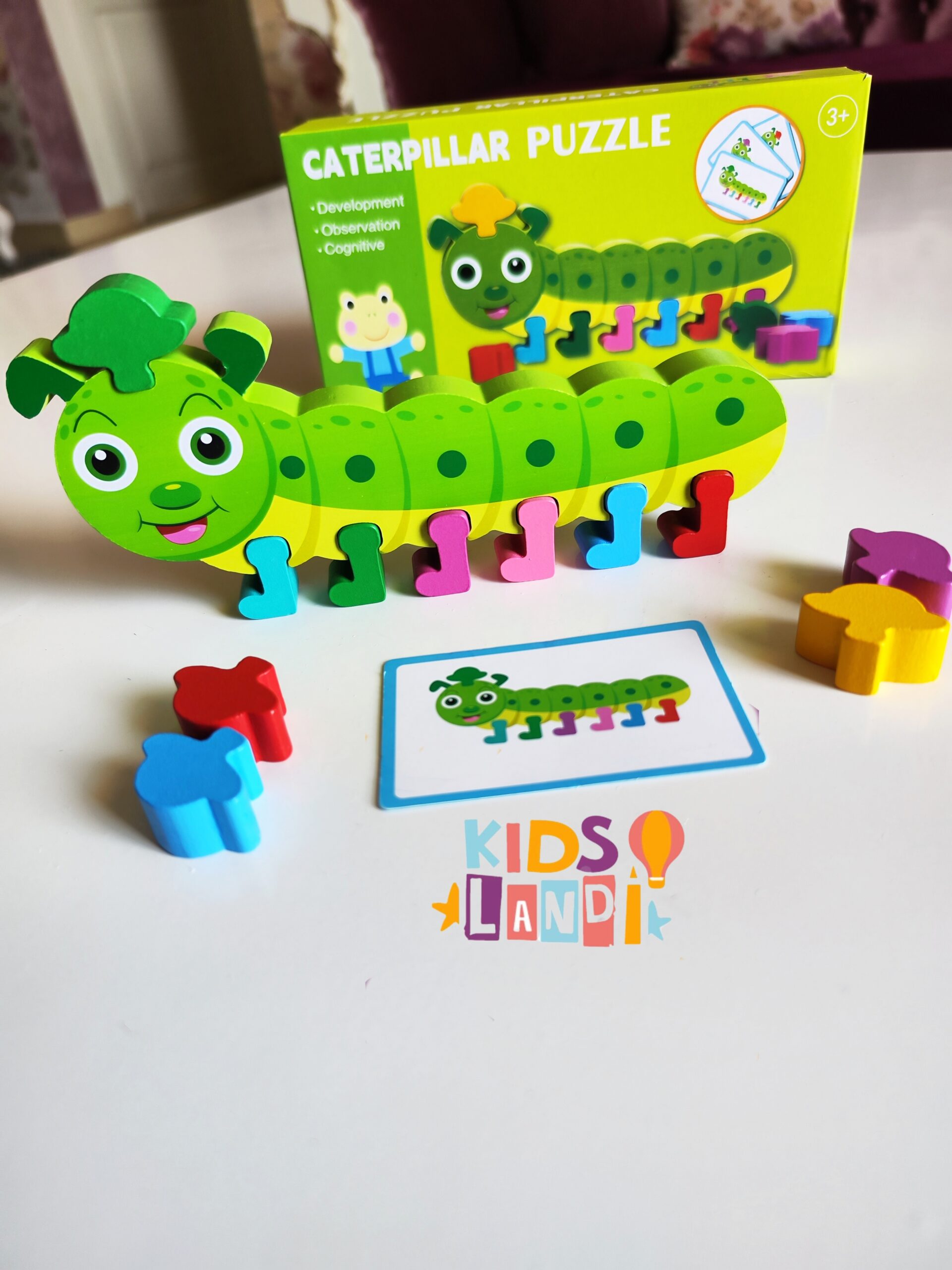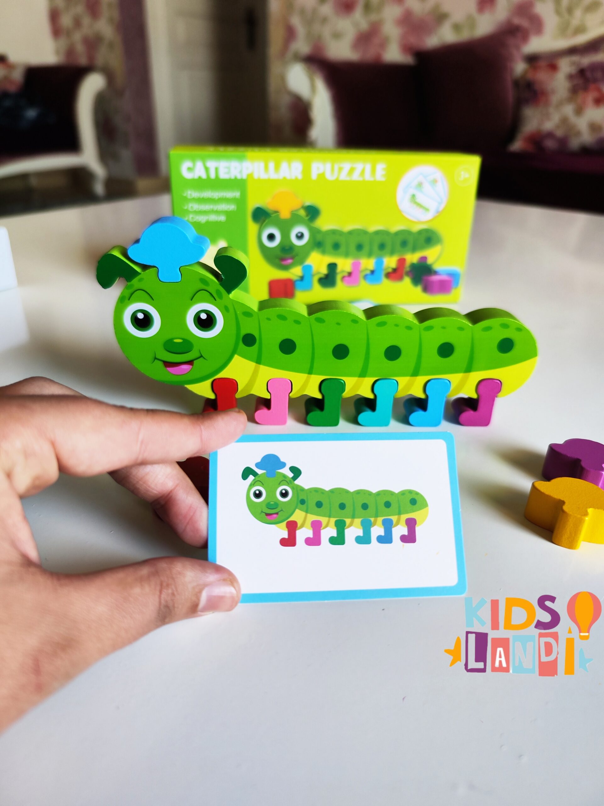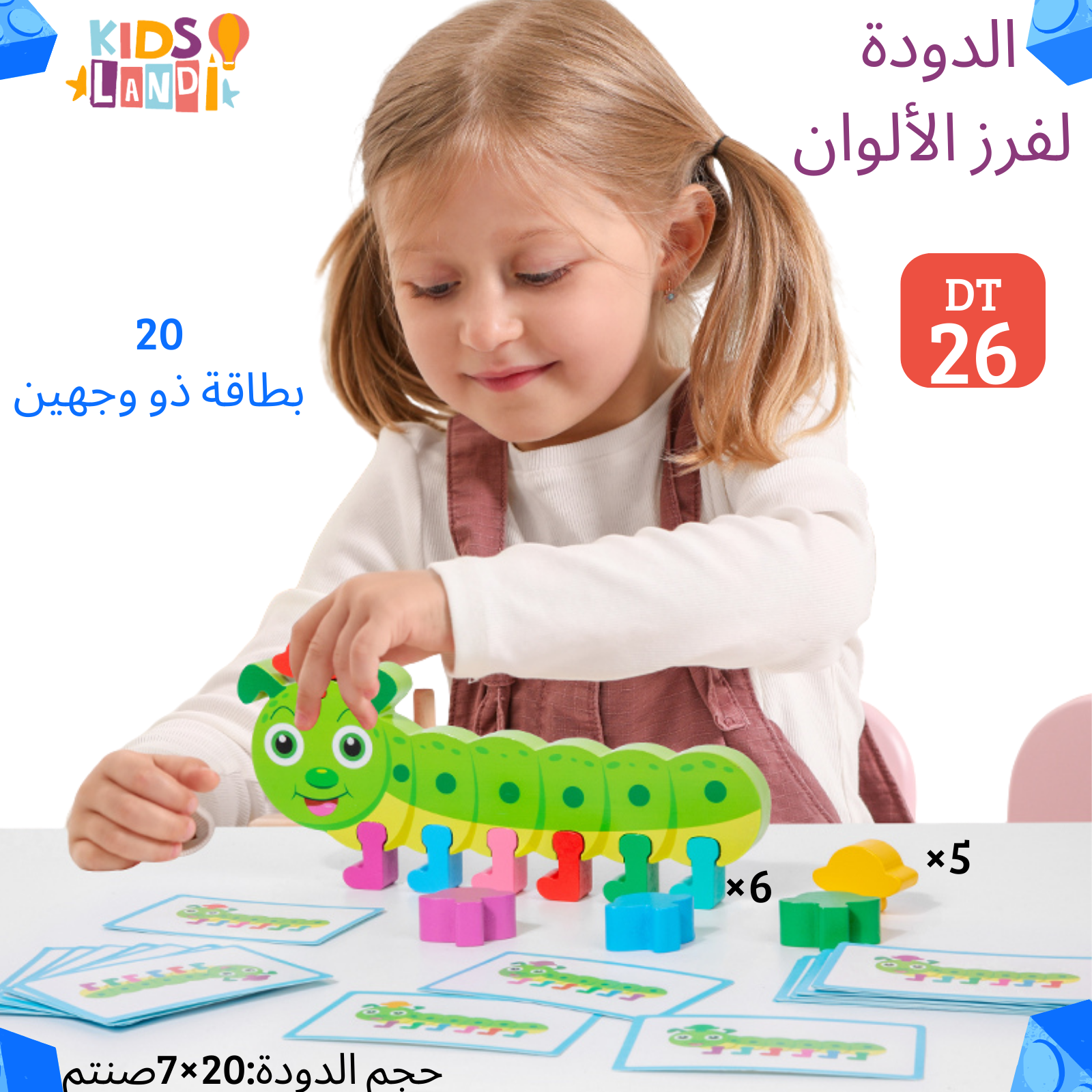 الطفل يشوف البطاقة، ويقوم بتركيب قطع الدودة حسب الألوان والترتيب الصحيح، باستعمال القطع الخشبية الملوّنة.