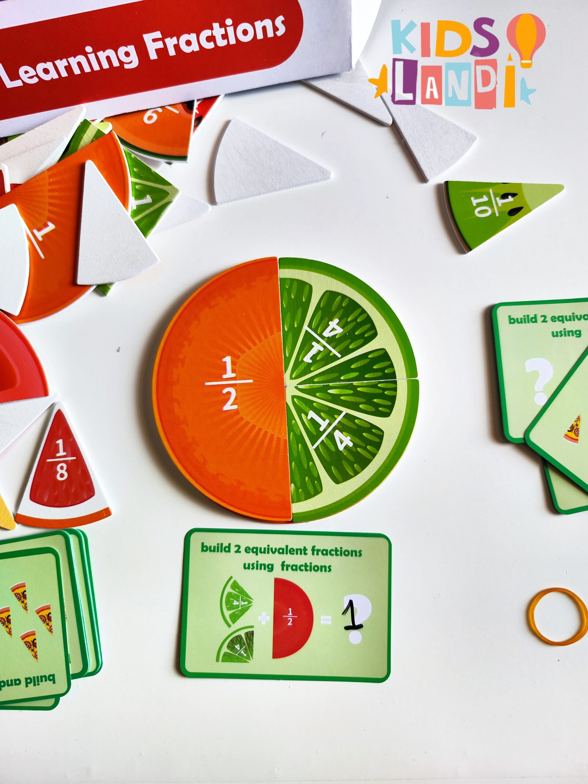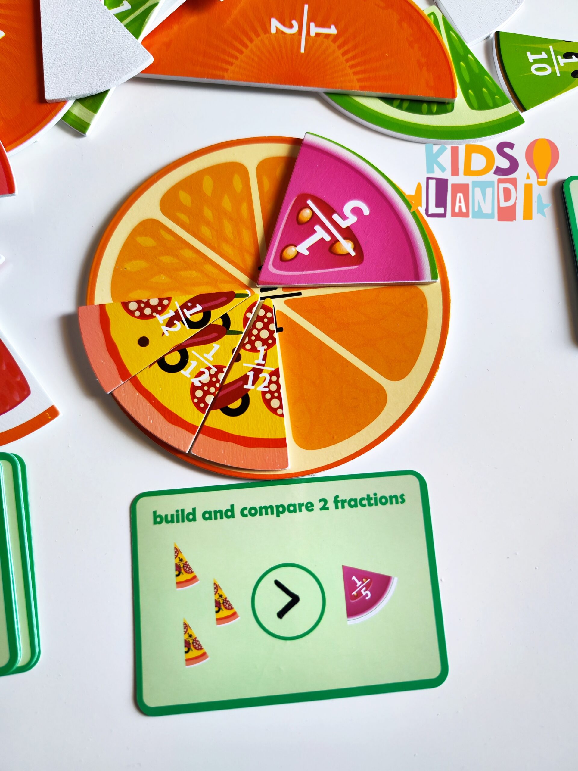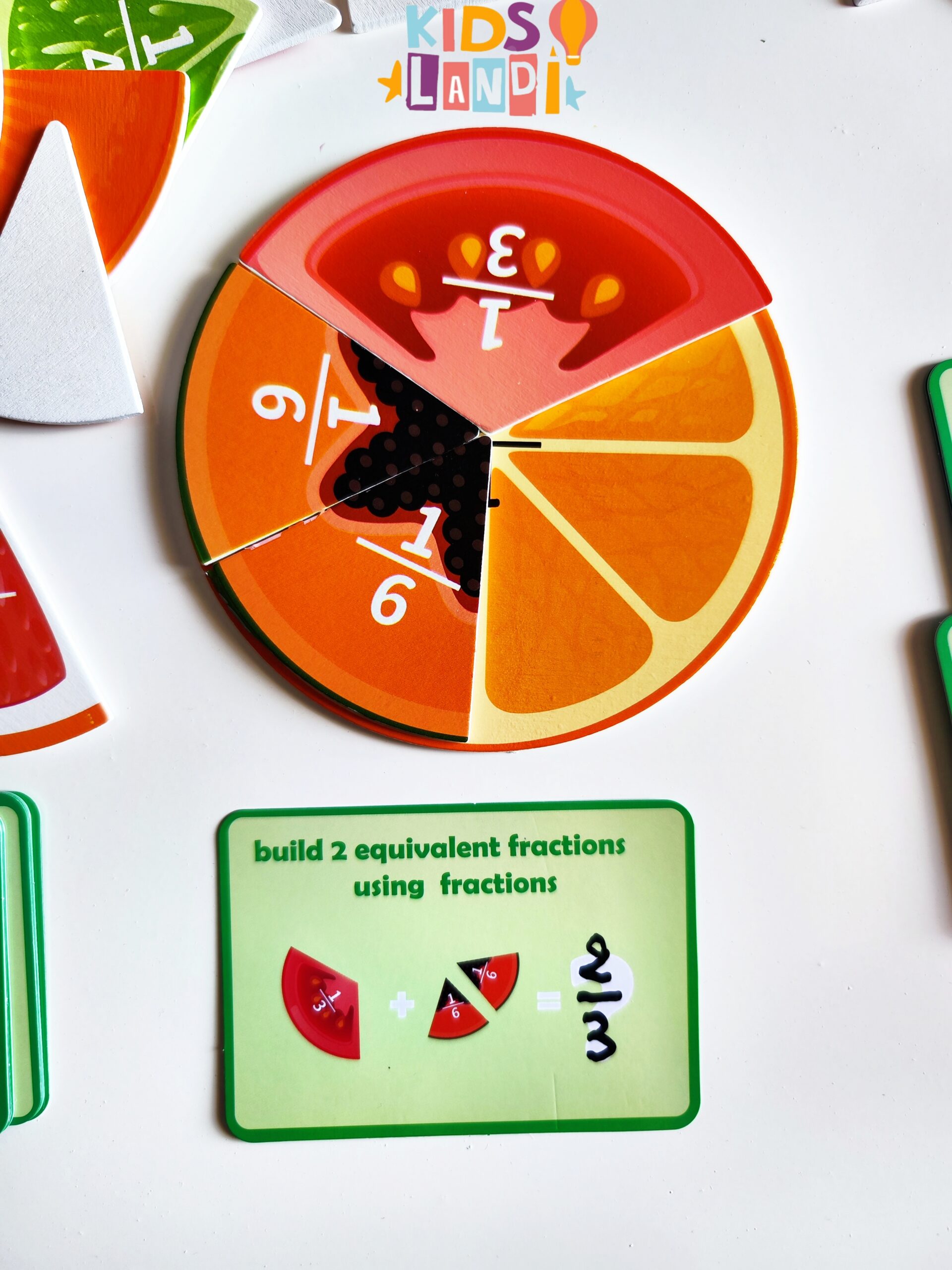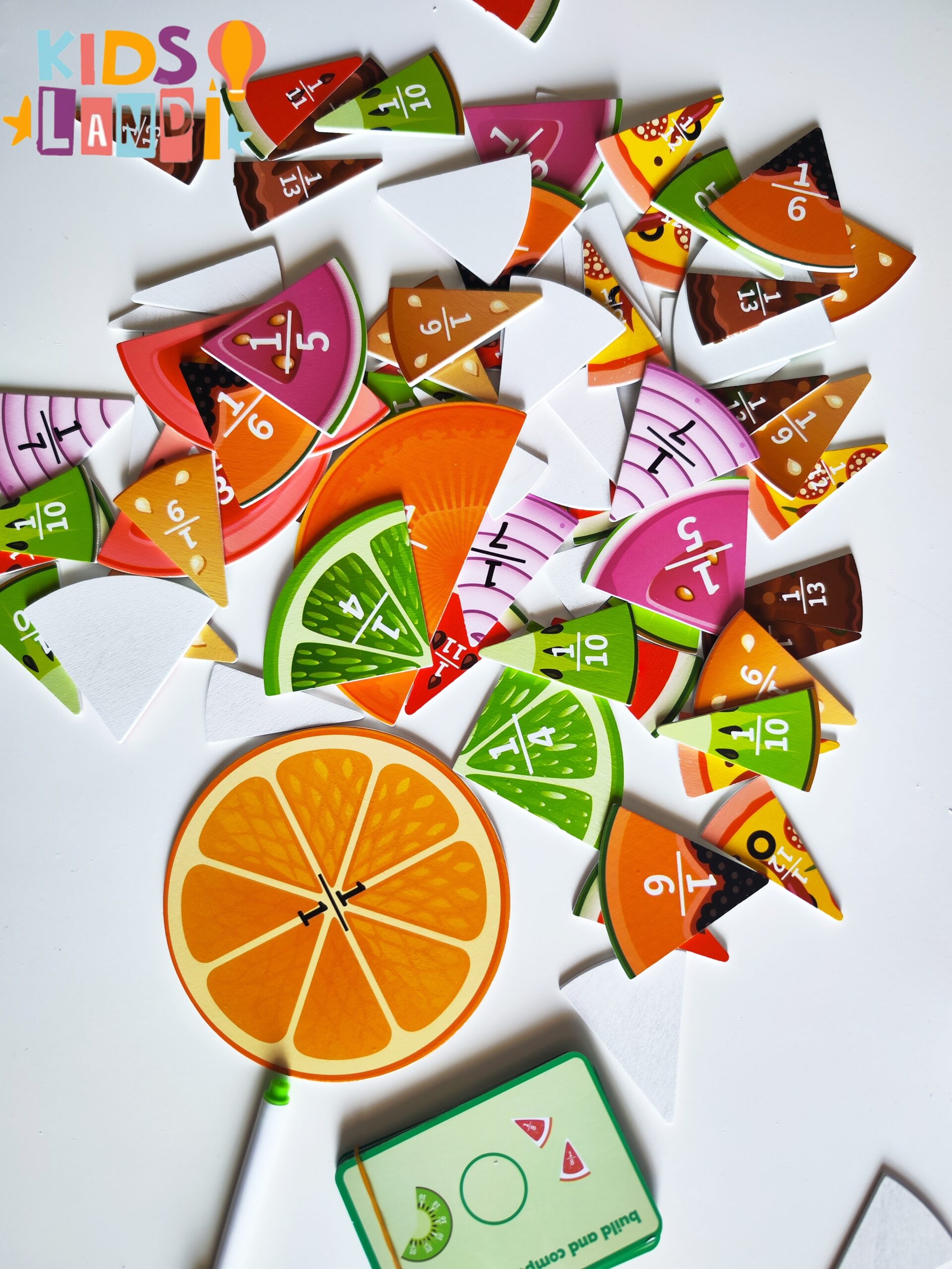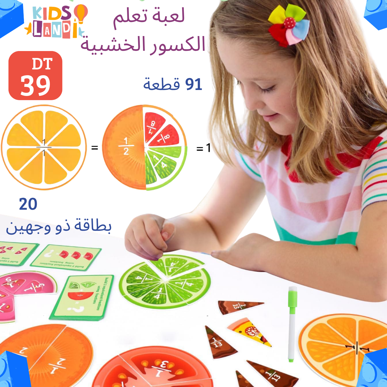 اللعبة هاذي هي لعبة تعليمية لتعلّم الكسور (Fractions). تتكوّن من قطع خشبية ملوّنة على شكل فواكه مقسّمة إلى أجزاء مختلفة، والهدف منها هو تعليم الطفل مفهوم الكسور بطريقة ملموسة وسهلة.