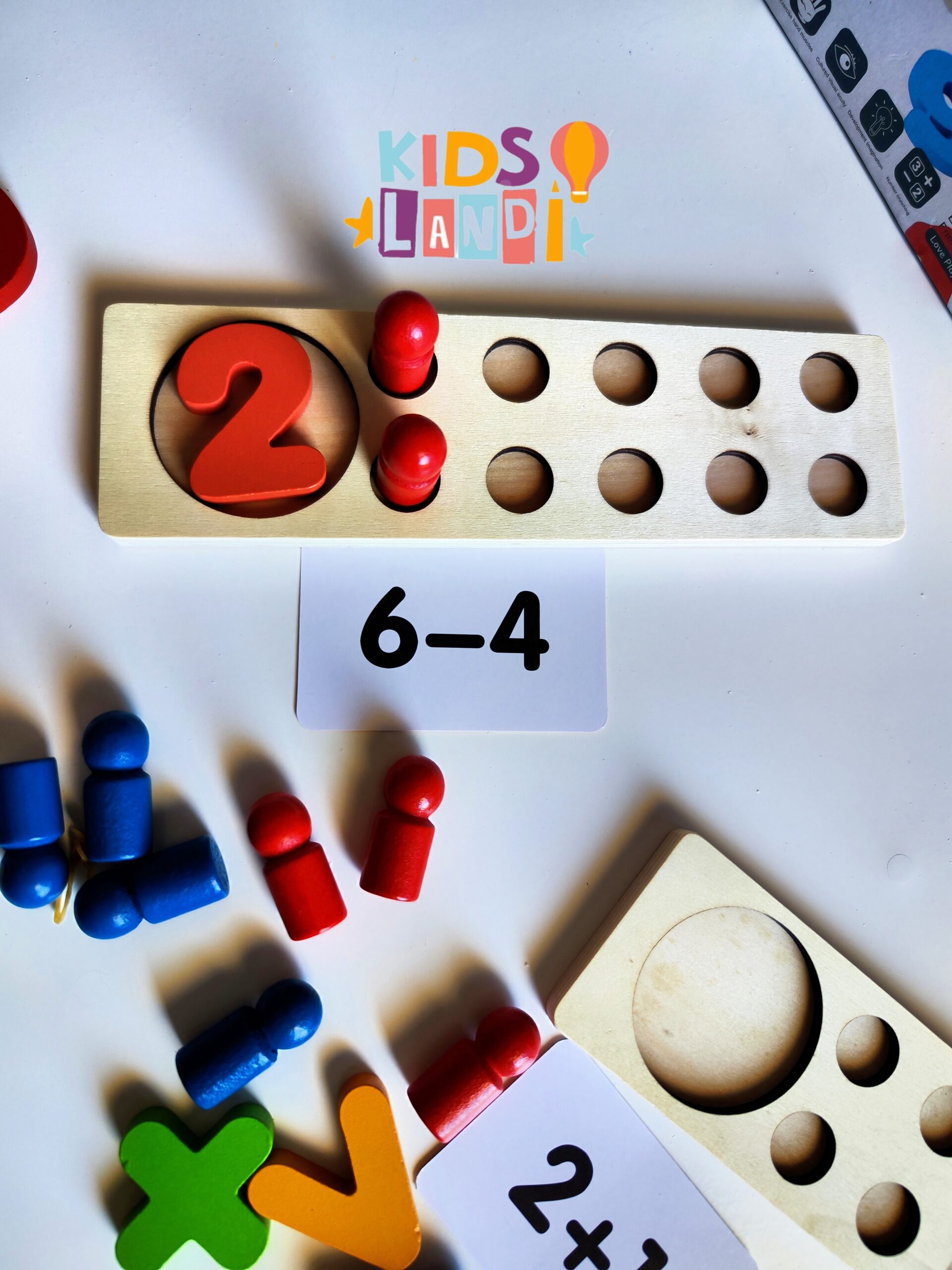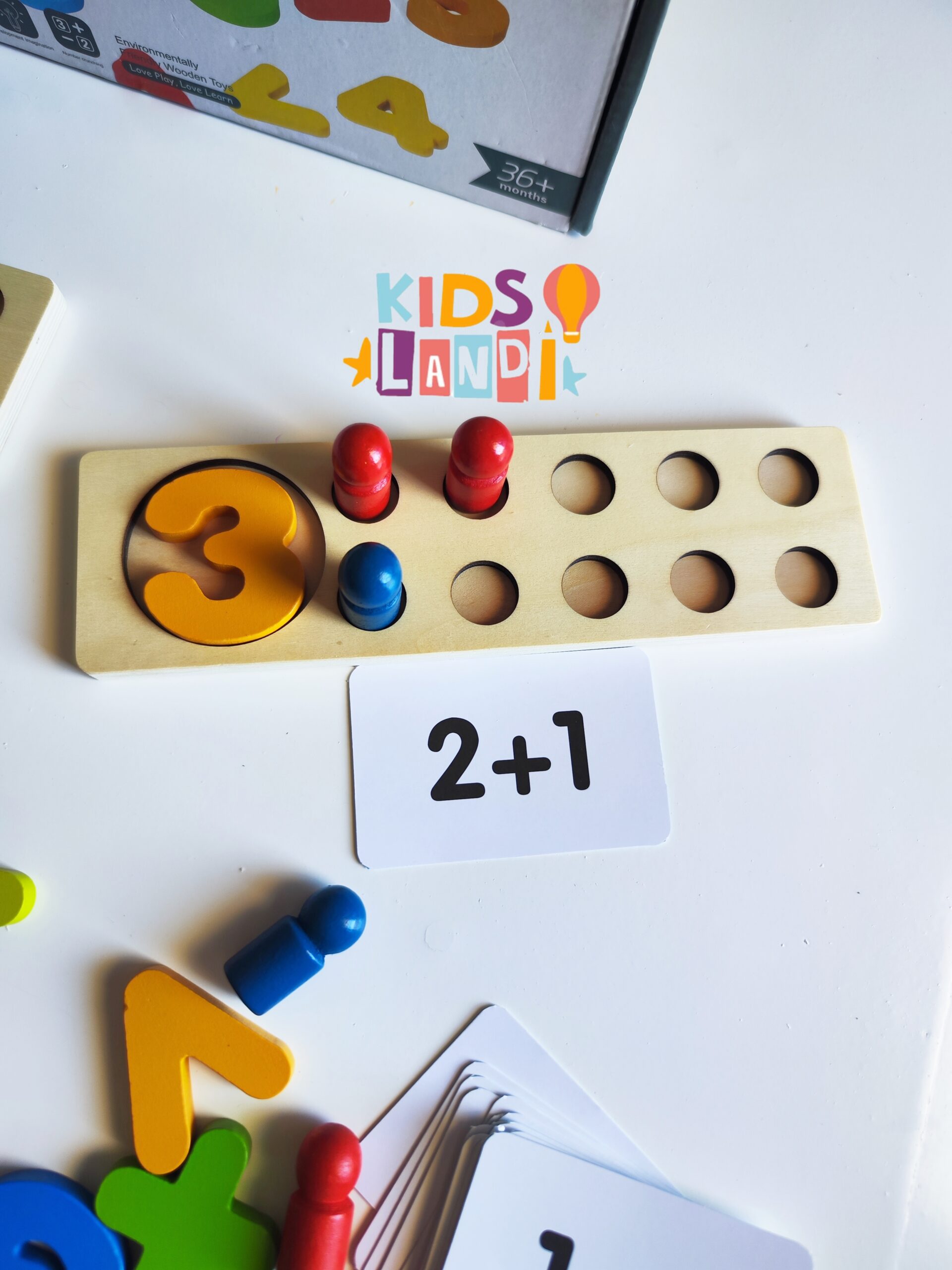 الطفل يختار بطاقة فيها عملية حسابية… ويحاول يلقّى الحلّ الصحيح باستعمال القطع المرفقة.